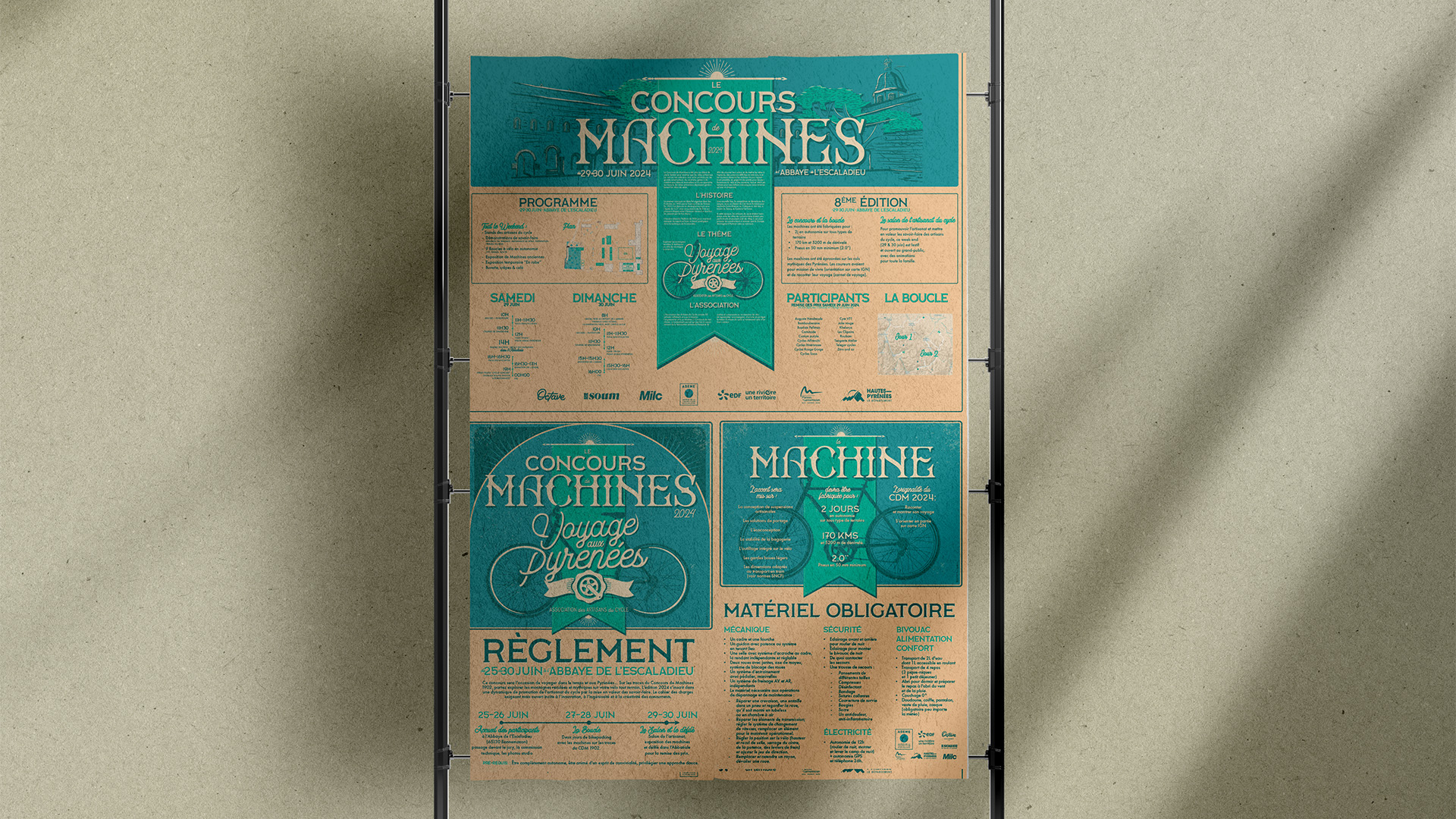 L’équipe de l’Association des Artisans du Cycle a fait appel à Rêver les Futurs pour imaginer la scénographie, l’identité visuelle et la communication de la 8ème édition du Concours de Machines (vélo artisanaux) qui s’est tenu dans le département des Hautes-Pyrénées. Impliqués dans le développement de la filière « vélo » dans les Pyrénées à plusieurs titre, notamment pour la création de la marque Pyrénées Vélo, nous avons été sollicités pour l’événement du Concours de Machines 2024.