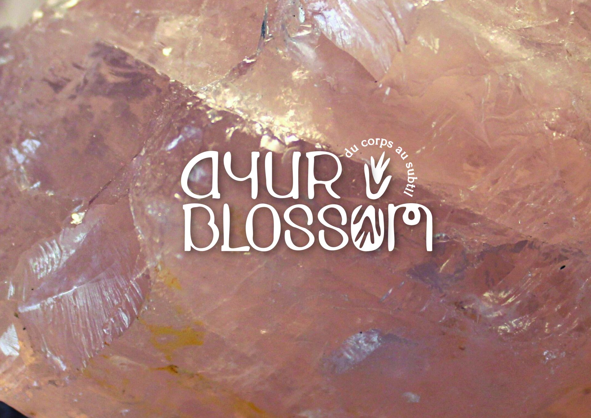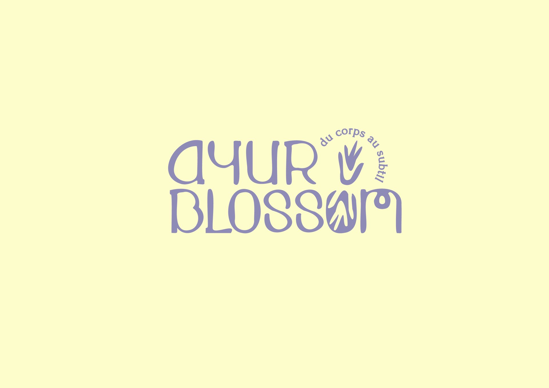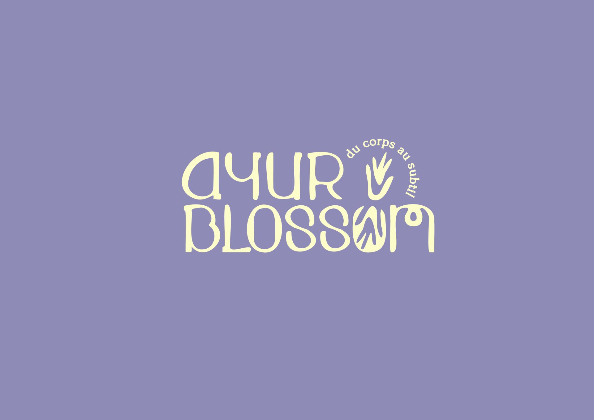 Ce parti pris créatif repose sur la création d’une typographie sur mesure. Le style des lettres fait référence à l’alphabet sanskrit et à l’univers des chakras. Le symbole pousse graphiquement dans le nom “Ayur Blossom” comme s’il prenait racine dans le O pour s’épanouir dans l’espace qui lui est dédié vers le haut, dans le sens “trouver sa place, rencontrer son essence pour s’épanouir”. C’est un miroir du dessin (faire communiquer tous les espaces de la personne entre eux) comme un reflet qui nous parle de nature, d’équilibre, de transformation, de vie et de mort. Un Ying et Yang revisité en mode ayurvédique !