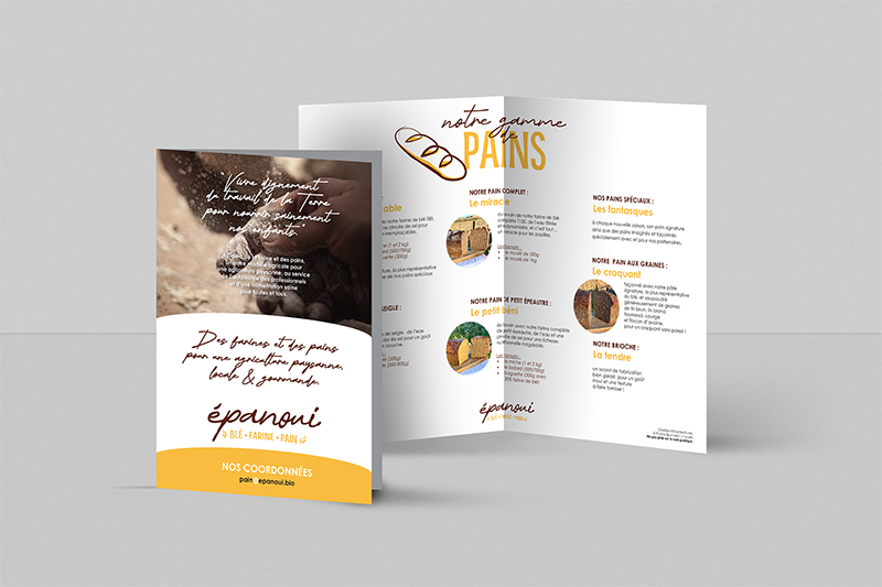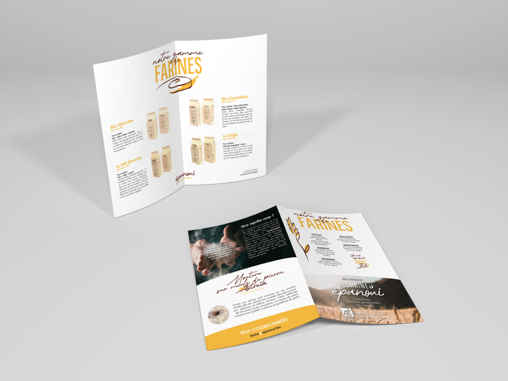 - créé trois brochures, la première pour présenter l’écosystème global et les deux autres pour présenter la gamme de pains et de farines aux partenaires, boulangers et revendeurs.