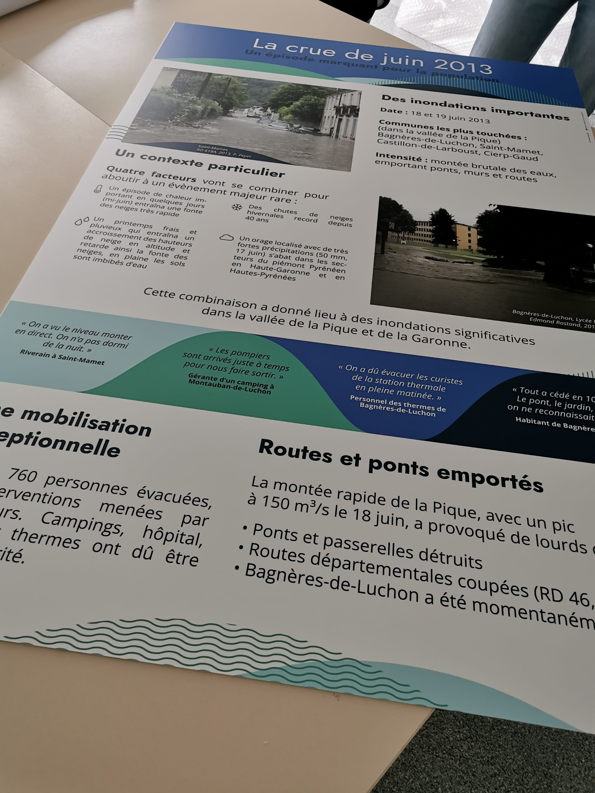 – à la livraison des fichiers : « Nous apprécions la justesse et la qualité de la réalisation que vous avez fait part pour ce projet dans un délai très court. Nous tenons à vous remercier pour votre efficacité, rigueur et votre patience. »– après la 1ère exposition : « Nous avons trouvé le rendu soigné et les couleurs choisies ressortaient super bien ! Concernant nos attentes quant à cet évènement, nous sommes contents et agréablement surpris par l’engouement des personnes présentes. Pour l’exposition, plusieurs personnes ont souligné la qualité du travail des supports et de la mise en scène. Ils ont affirmé aussi une volonté de voir davantage d’exposition/animation sur les questions de risques naturels. Notre objectif était d’alimenter la culture du risque d’inondation sur le territoire à travers les crues historiques de la Pique et nombreux d’entre eux nous ont partagé leur vécu de 2013 qui est encore frais dans leur mémoire.