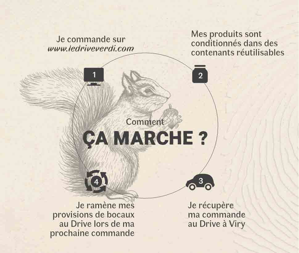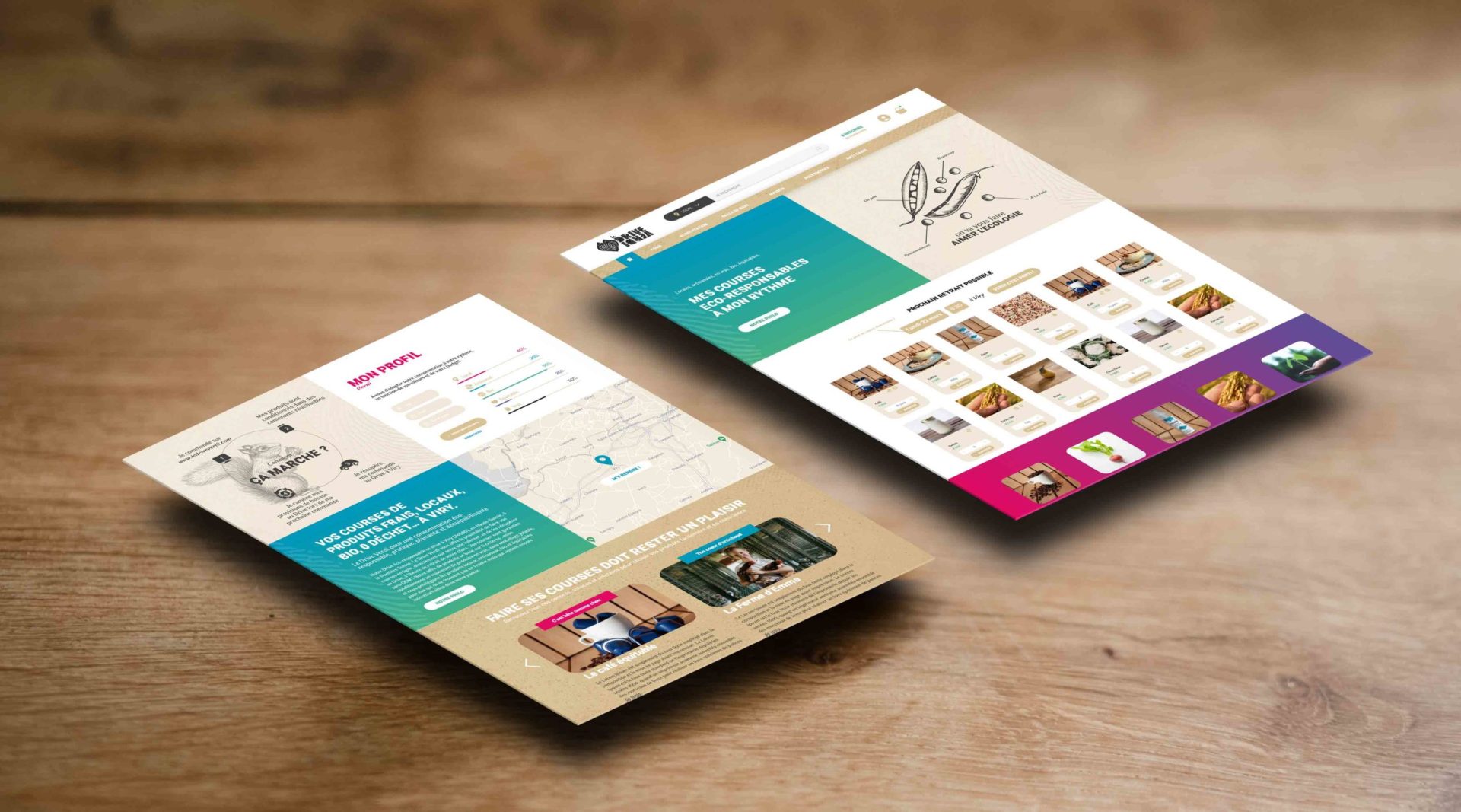 • Le symbole et la typographie, à la fois végétales et élégantes, montrent que le Drive est verdi à la racine. Ce n’est pas un logo qui s’est mis un coup de pinceau vert pour faire écolo mais une marque de convictions engagée dans un combat contre le greenwashing.