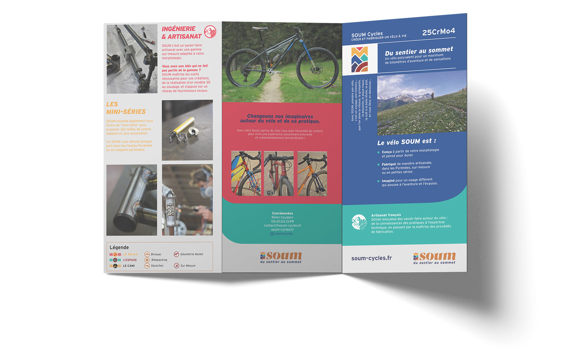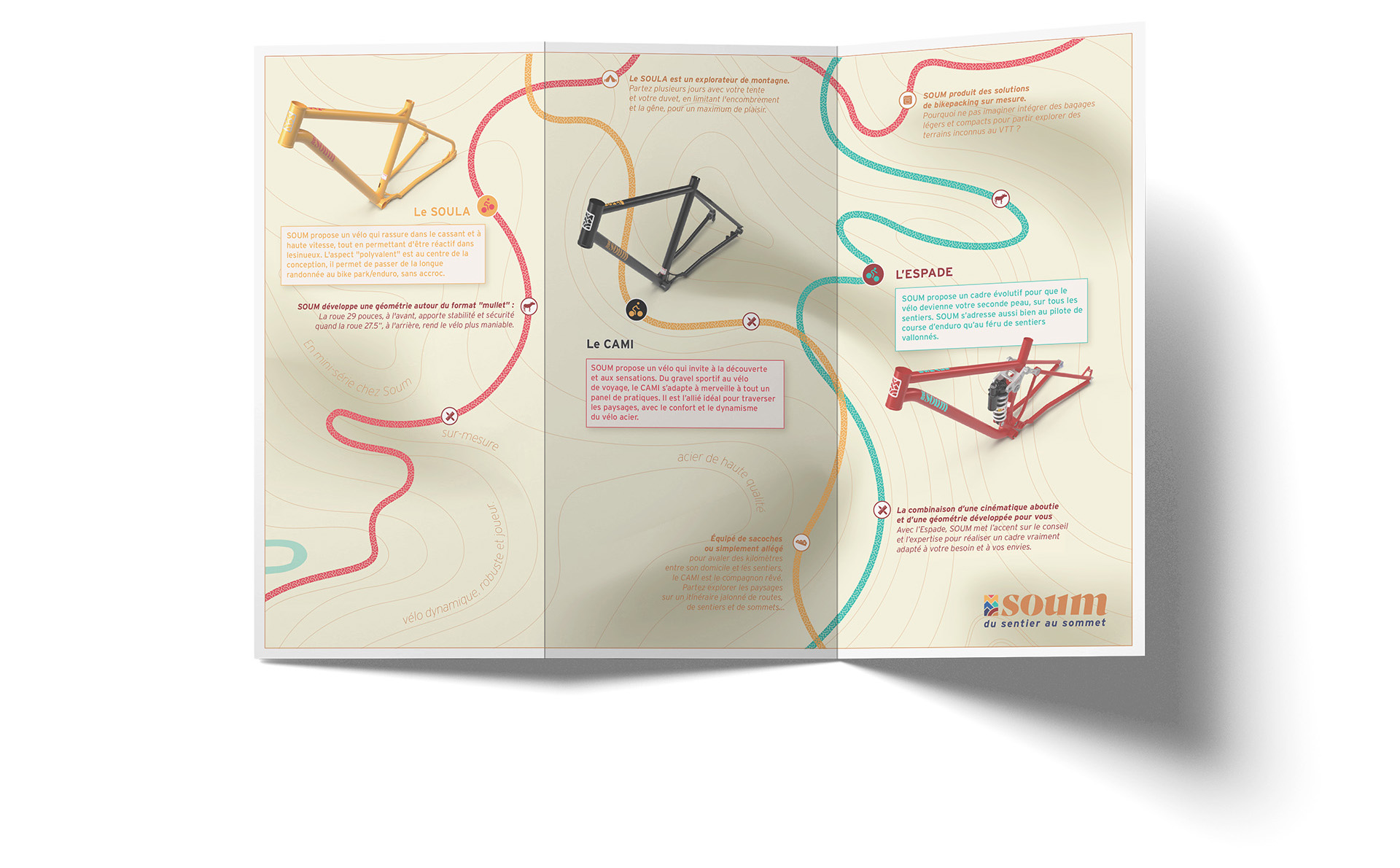 Nous avons choisi un format vertical long 6 pages, pli roulé. Imprimé sur du papier FSC au grammage fin, il permet d’obtenir une ressemblance maximale à la carte IGN. Le flyer présente la marque, sa valeur ajoutée, sa gamme de cadre et toutes les options (bikepacking, sur-mesure). Un support de communication polyvalent donc, à l’image des cadres SOUM !