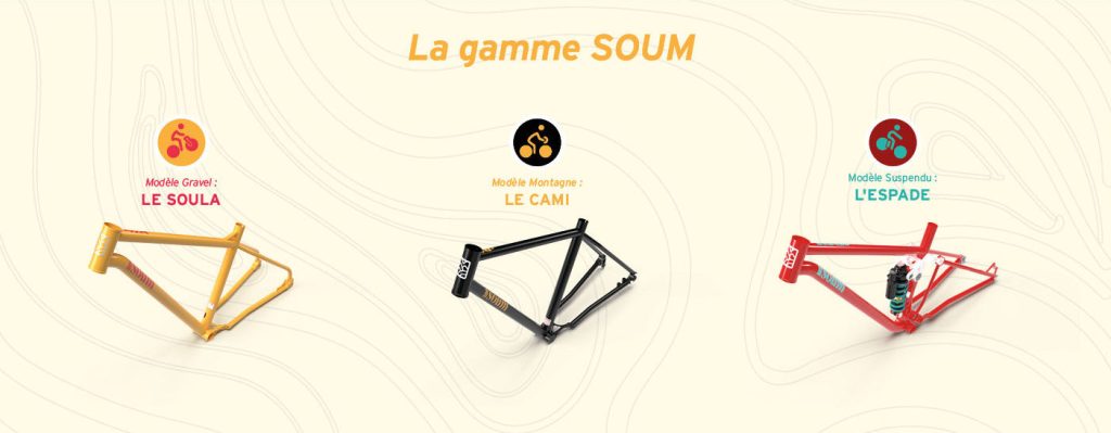 SOUM signifie Sommet. Dans l’esprit de la marque, un client SOUM ira au sommet par le sentier, toujours en vélo. Le vélo SOUM est polyvalent et adapté à la morphologie de son propriétaire, ce qui lui permet de partir en Soum depuis son domicile.
