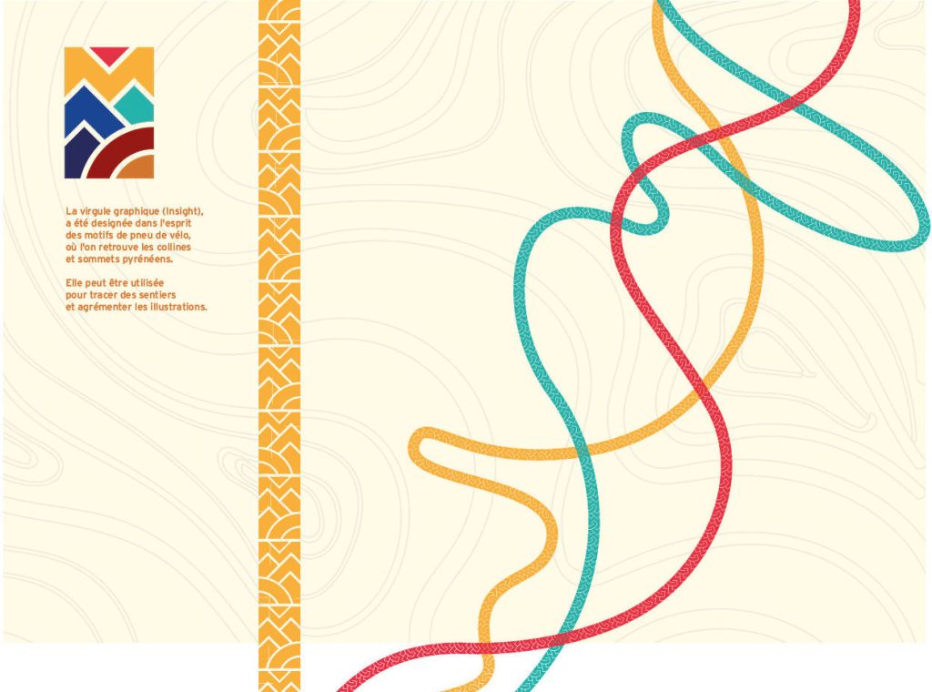 L’univers chromatique de l’identité est à la fois élégant, avec une dominante naturelle “terre de sienne”, et joyeuse avec une palette colorée. Le fond couleur “sable” met en valeur le logo et amène un aspect “nature” et “artisanal”. Il évoque la carte topographique pour se repérer en randonnée.